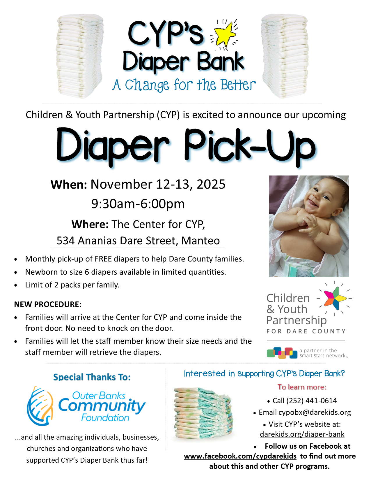 CYP's next contactless Diaper Pick-Up will be held on November 12-13 from 9:30am-6:00pm at the Center for CYP in Manteo (534 Ananias Dare Street, Manteo). Please note the new procedures.