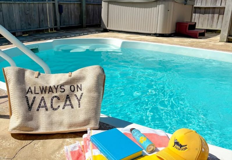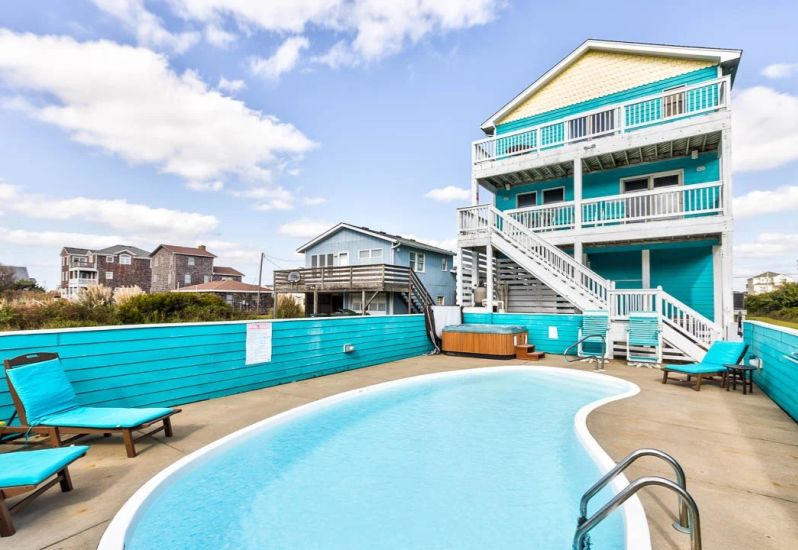 Just For Fun is a 5 bedroom, semi-oceanfront, dog-friendly home in South Nags Head that offers a heated private pool, elevator, hot tub, pool table, and more. Guests noted that the home well designed for large families, it was very clean, and the walk to the beach was easy and convenient!✨