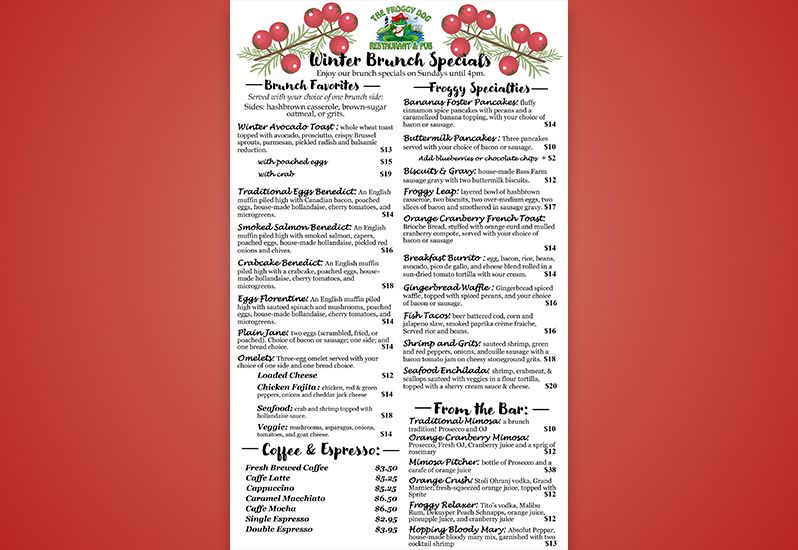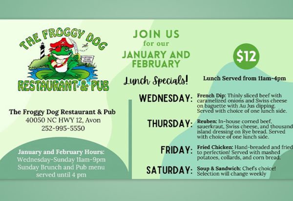 Come by all January and February for our new lunch specials! 🐸🏴☠️ Open Wednesday - Sunday all Winter long!