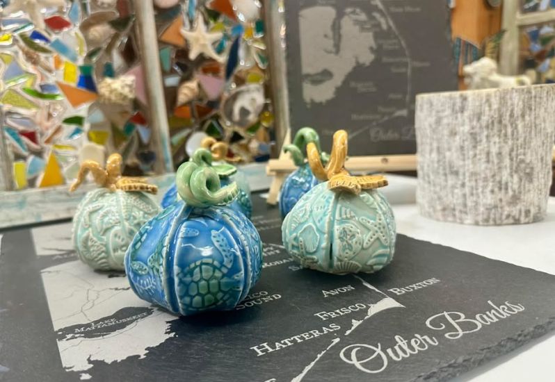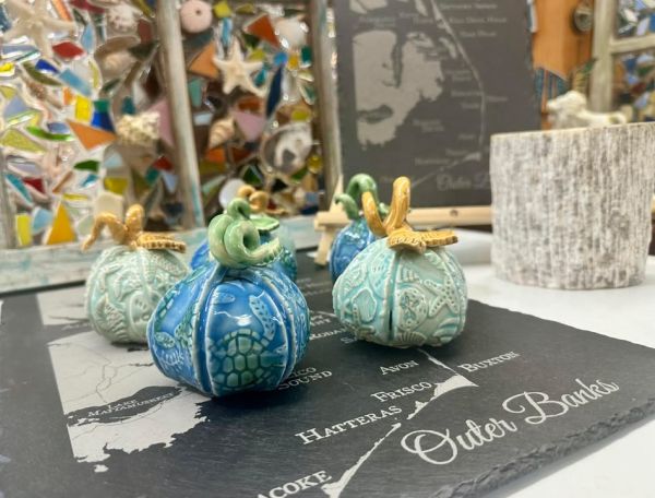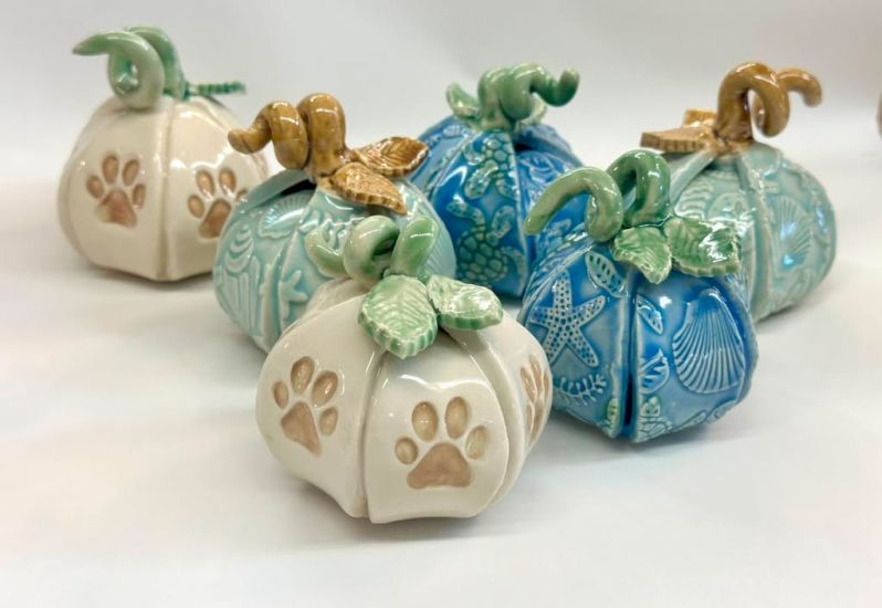 Two Pups Pottery has just a few pumpkins left for this season. They are available in blue with turtles or seafoam with shells. We ship!!!