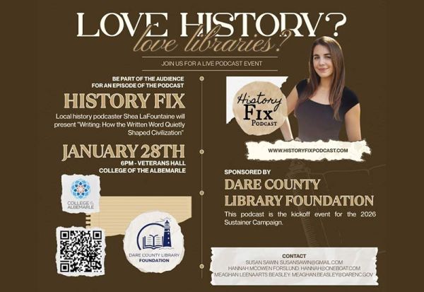 Local history podcaster Shea LaFountaine will present "Writing: How the Written Word Quietly Shaped Civilization" at Veterans Hall, College of the Albemarle on January 28 2026 at 6 pm. A Q & A will follow the presentation - a lively discussion is expected! This event is free and open to the public.