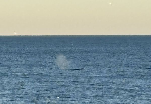We had at least one whale swim past the end of pier yesterday. Kenny got this photo and Christin made of a sound recording of a one nearby along with dolphins and a snapping shrimp.