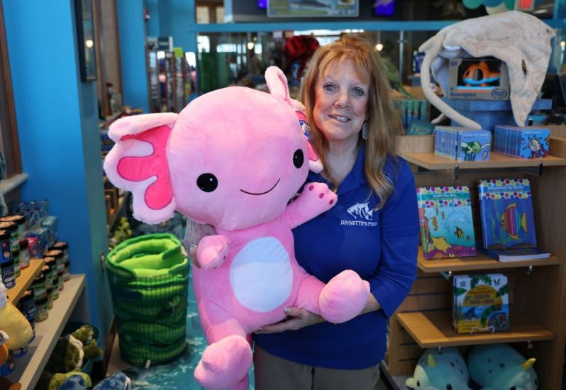 Waiting for the #fish to bite! #Ocean water temp 58 degrees. A gentle NE #breeze of 8 knots coming in from the ocean. High tides 5:55 a.m. and 6:07 p.m. Low tide 12:29 p.m. Dotti holds an #Axolotl stuffed animal in our Pier #Shop.
