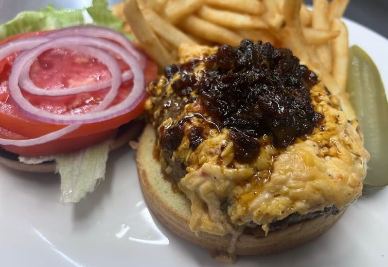 Burger Night!! Hop in and give this Pimento Cheese Burger topped with our Housemade Bacon Jam a try! Swipe to see all the other Burgers & Dinner Specials #waterfrontdining #burgernight