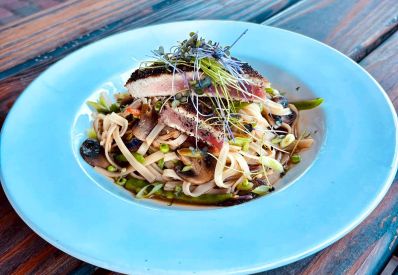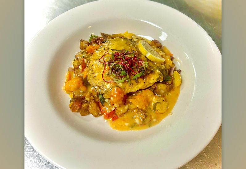 Pan Seared Rockfish layered with heirloom tomatoes, mild red and yellow peppers, Serrano ham, and a crispy smashed Yukon gold potato 🤌🏻 A fan favorite that always steals the spotlight!