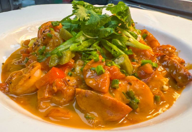 There's some really excellent stone ground yellow grits from SC underneath it all, the sauce is a bisque we make with the heads of the shrimp plus andouille sausage, pickled okra, scallions and herbs. We are back in love with low-country shrimp & grits again. On our menu now, I promise you will enjoy this faithful rendition of a Carolina staple.