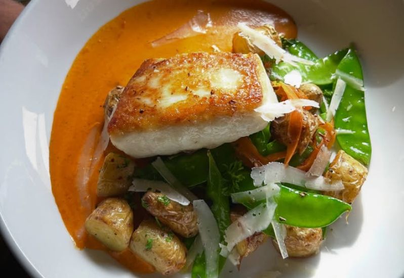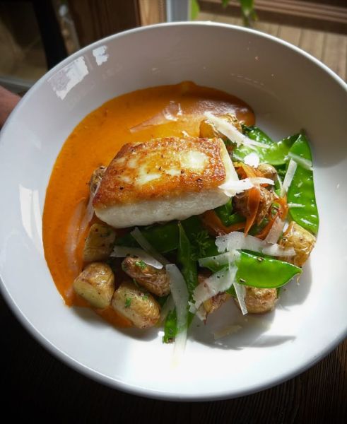 Today’s special: Seared Halibut with garlic rosemary roasted fingerling potatoes, sautéed snow peas, and carrots over a roasted red pepper cream sauce