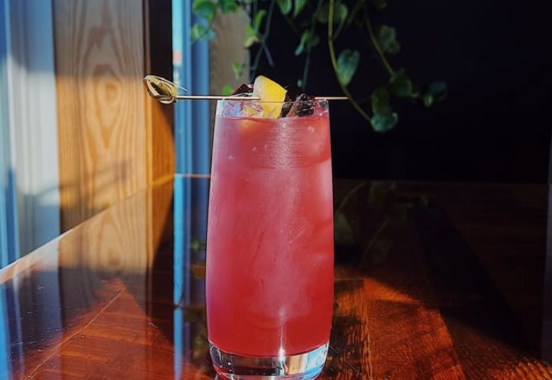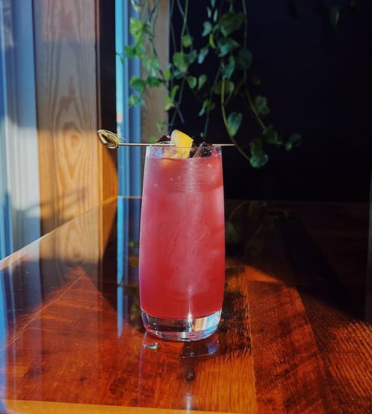 made with Bombay Sapphire gin, pomegranate and lemon juice, Luxardo cherry syrup, and a splash of soda water