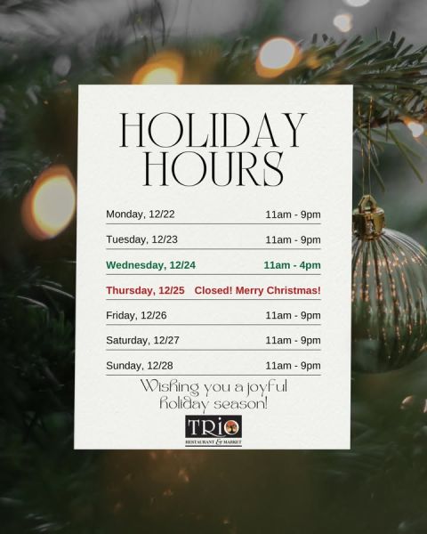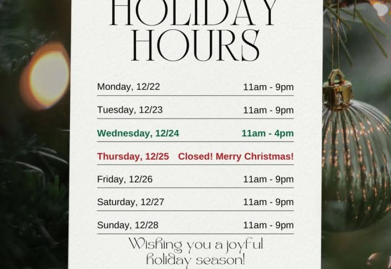 Next week’s hours! We will be open for a half day on Christmas Eve for all your last minute needs and closed on Christmas Day to spend time with friends and family. Regular hours will resume on the 26th!
