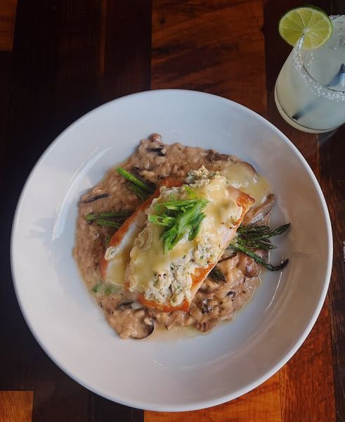 with crab imperial, mushroom risotto, roasted asparagus, and finished with beurre blanc