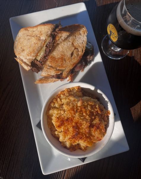 Today’s special: Pulled short rib sandwich with melted Emmentaler cheese, sautéed mushrooms, pickled onions, and kimchi mayo on grilled sourdough bread