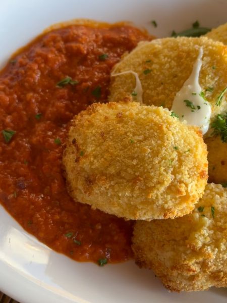 Perfect weather for comfort food. Baked mozzarella with a roasted red pepper and tomato sauce on special today!
