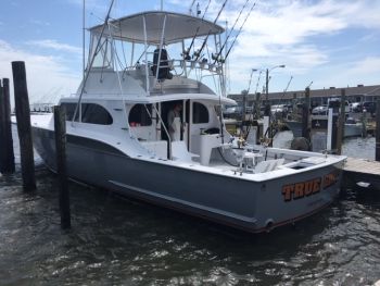 True Grit is a 54-foot Paul Mann beauty that’s ready to roll! Powered by a Caterpillar 825 engine, she cruises at a solid 24 knots, getting you to the action fast. Inside, the cabin features two air conditioners to keep you cool while you kick back in comfort. Relax in the spacious seating area with a TV, VCR, and stereo, or grab a snack with plenty of fridge and freezer space, plus a microwave for longer trips.