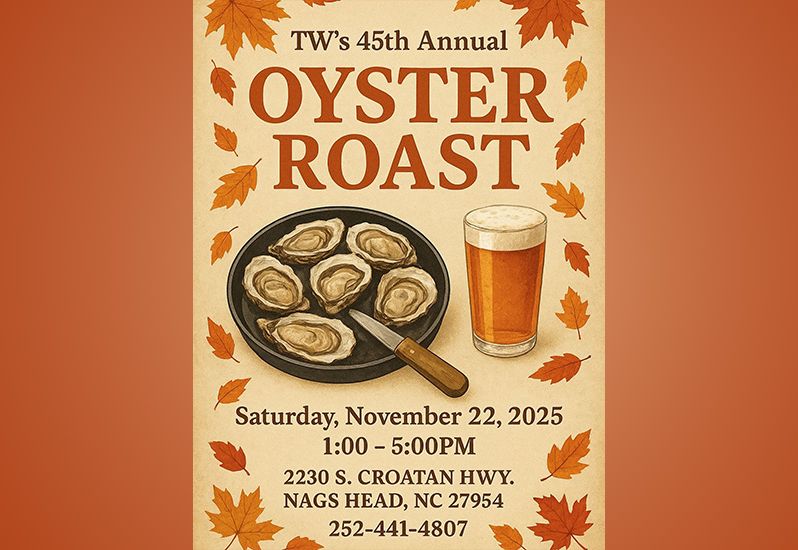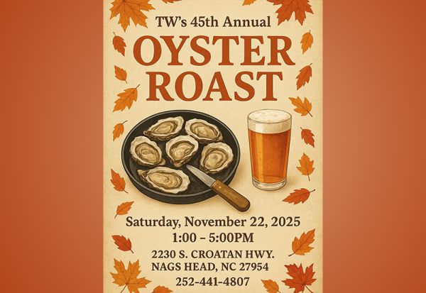Join us for TW’s 45th Annual Oyster Roast! On Saturday, November 22nd from 1 to 5PM, we’ll be serving fresh oysters, cold beer, BBQ, and much more!