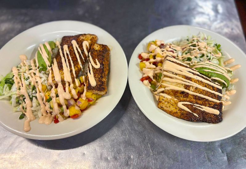 Seafood Bowl with Grilled Mahi~ cilantro slaw, avocado, tomatoes & pineapple salsa over rice $22.99!!