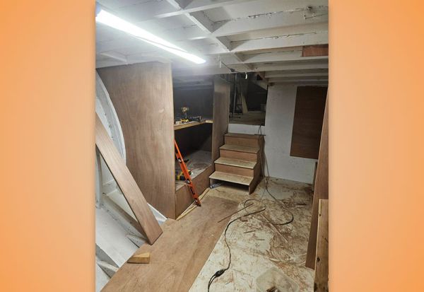 Progress! We will finish blocking for sonar tube today. Be ready for fiber glass tomorrow. Dennis will finish walls for head and shower base, then we can install bulkhead forward and start on anchor locker in bow.