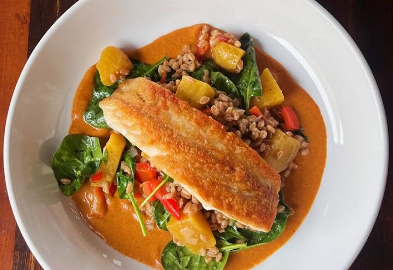 served over roasted garlic farro, golden beets, wilted spinach, and finished with a roasted red pepper and charred lemon cream